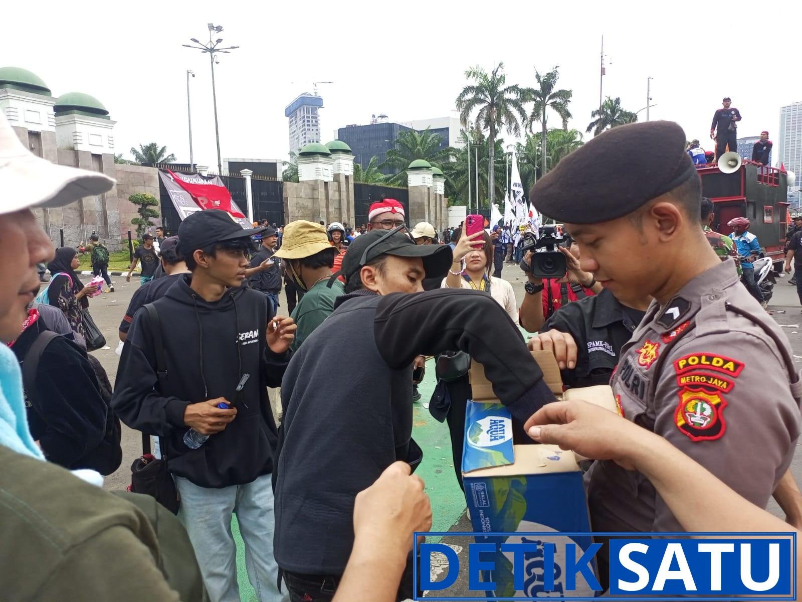 Pembagian air mineral dan roti ini menjadi bagian dari upaya Polri dalam memberikan pelayanan humanis kepada masyarakat yang sedang menyampaikan aspirasi.
