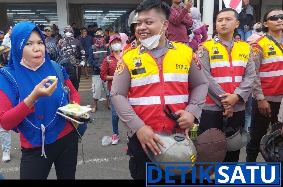 Sejumlah petugas berdiri di titik strategis, menyambut peserta yang datang dengan sapaan ramah dan arahan singkat. “Dari awal datang, saya langsung diarahkan dengan jelas. Polisi menyampaikan dengan sopan, jadi kita merasa dihargai,” kata Eti (32), salah satu peserta aksi.