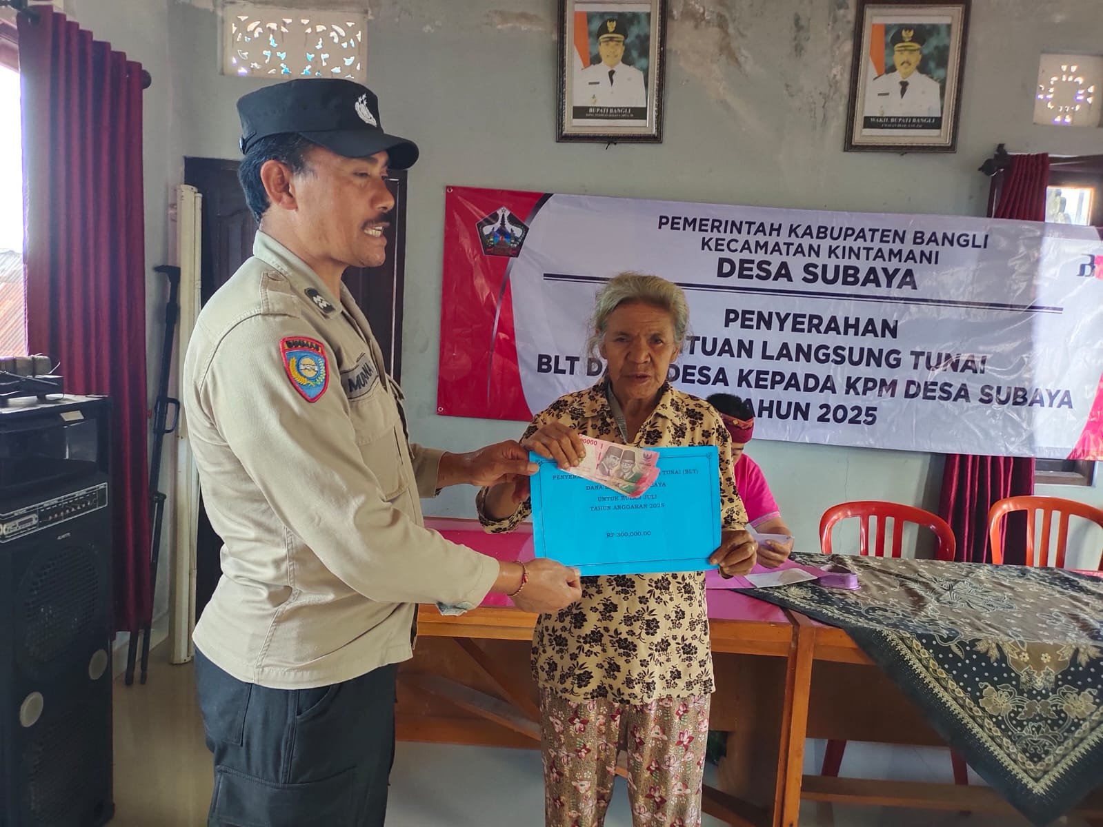 Kintamani – Bhabinkamtibmas (Bhabin) Desa Subaya, AIPTU Wayan Mudiana, melaksanakan pendampingan dalam kegiatan penyaluran Bantuan Langsung Tunai (BLT) Dana Desa Tahap 7 kepada 25 (dua puluh lima) Kepala Keluarga penerima manfaat di Desa Subaya. Kegiatan ini dilaksanakan di Ruang Rapat Kantor Desa Subaya, Kecamatan Kintamani, Kabupaten Bangli.