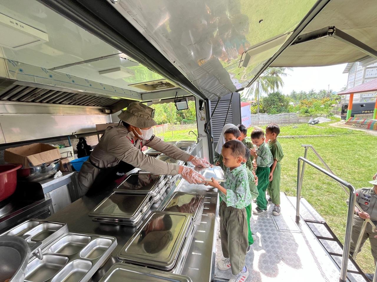 70 siswa-siswi antri satu persatu antri menuju mobil dapur lapangan Satbrimob Polda Sulteng untuk mendapatkan Makan Bergizi Gratis, didampingi oleh dewan guru serta Kepala Madrasah.