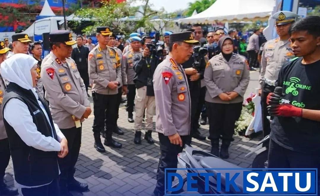 Adapun peserta apel terdiri dari 180 personel Bhabinkamtibmas, 150 anggota Satsamapta, serta 4.425 driver ojol dari berbagai wilayah di Jawa Timur.