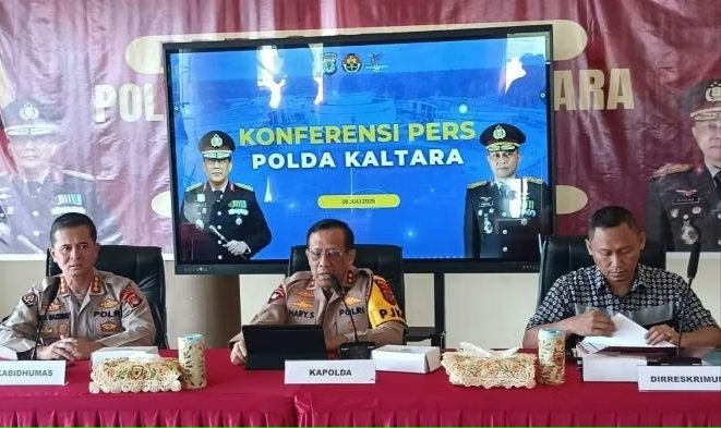 Kaltara. Detiksatu.id – Dalam Konferensi Pers yang digelar di Selasar Gedung B Mapolda Kaltara yang dipimpin oleh Kapolda Kaltara Irjen Pol. Hary Sudwijanto, S.I.K., M.Si., didampingi oleh Dirreskrimum Polda Kaltara Kombes Pol. Yudhistira Midyahwan, S.I.K., S.H., M.Si dan Kabid Humas Polda Kaltara Kombes Pol. Budi Rachmat, S.I.K., M.Si., buka suara terkait penangkapan 4 (empat) oknum anggota Polres Nunukan. Jum’at (18/07/2025)