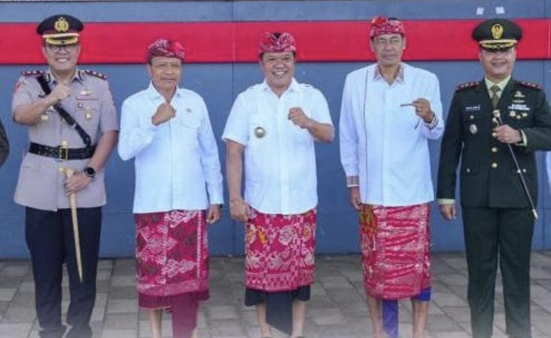 Kepala Kepolisian Resor (Kapolres) Bangli, AKBP James Irianov Syaloom Rajagukguk, S.I.K., M.H., menghadiri upacara peringatan Hari Jadi ke-67 Provinsi Bali untuk mewujudkan visi “Nangun Sat Kerthi Loka Bali”, di Alun-alun Kota Bangli, pada Kamis (14/08/2025).