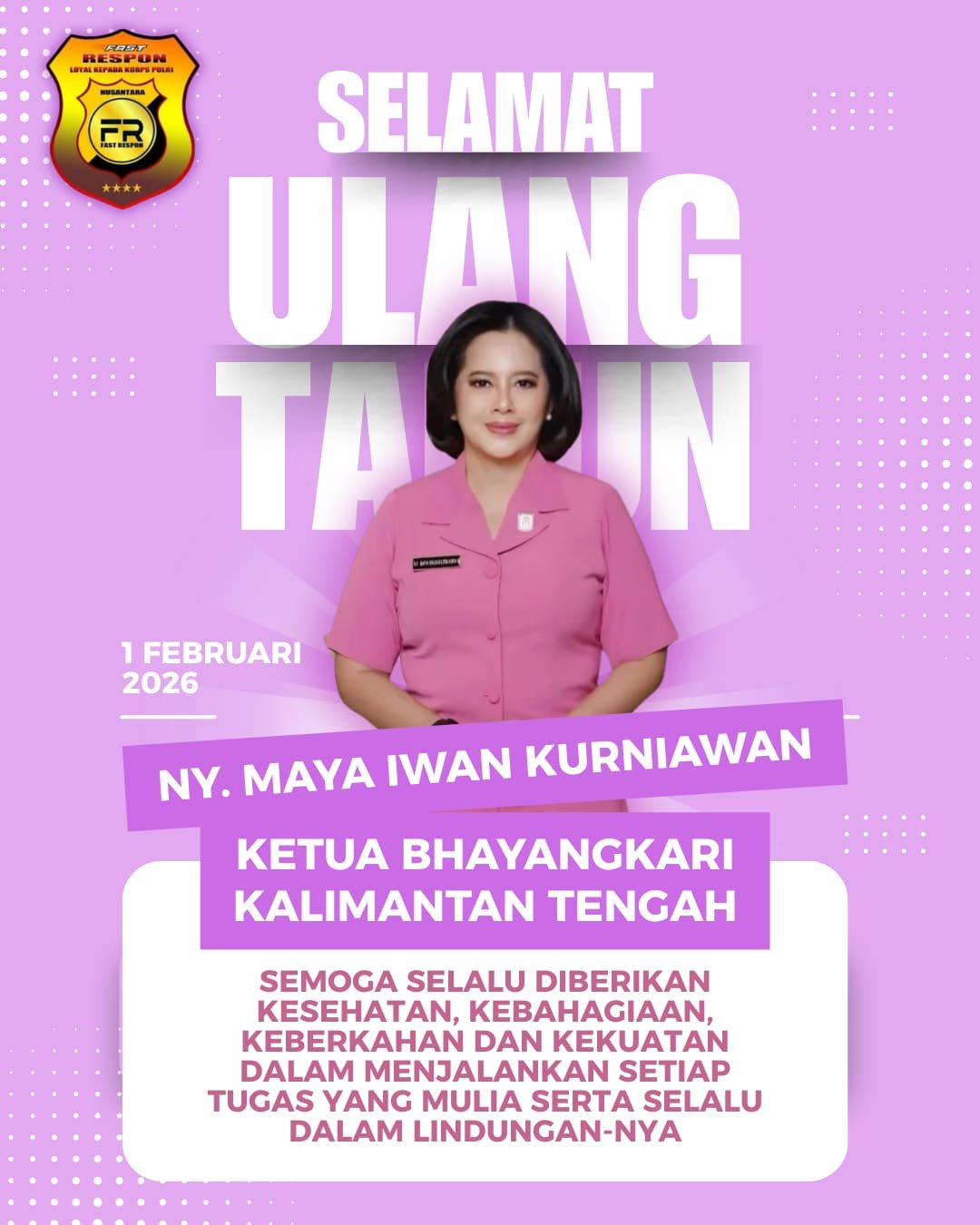 Jakarta, Detiksatu.id – Ketua Umum Perkumpulan Wartawan Fast Respon (PW-FRN), Agus Flores, beserta seluruh jajaran pengurus menyampaikan ucapan selamat ulang tahun kepada Ketua Bhayangkari Daerah Kalimantan Tengah, Ny. Maya Iwan Kurniawan, yang merayakan hari kelahirannya pada hari ini, Minggu, 1 Februari 2026.