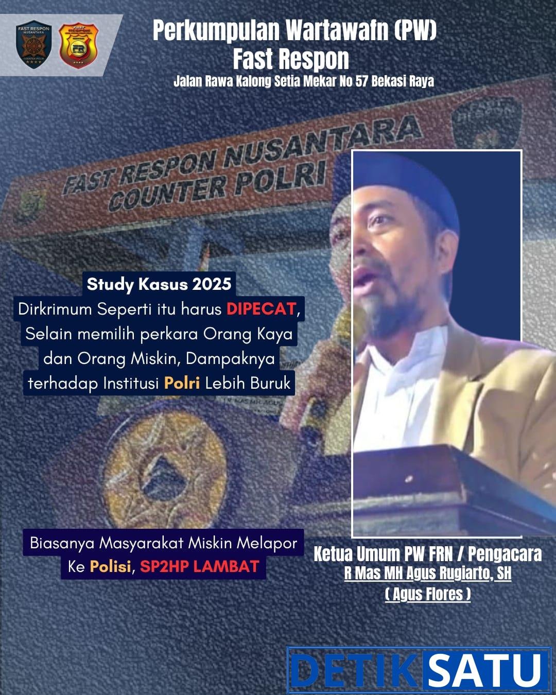 Jakarta, Detiksatu.id — Ketua Umum Pimpinan Wilayah Fast Respon Nusantara (PW FRN) Counter Polri Nusantara, Agus Flores, menyampaikan kritik keras terhadap dugaan praktik diskriminatif dalam penanganan perkara di lingkungan Kepolisian Republik Indonesia.Tanggal: 15 Oktober 2025
