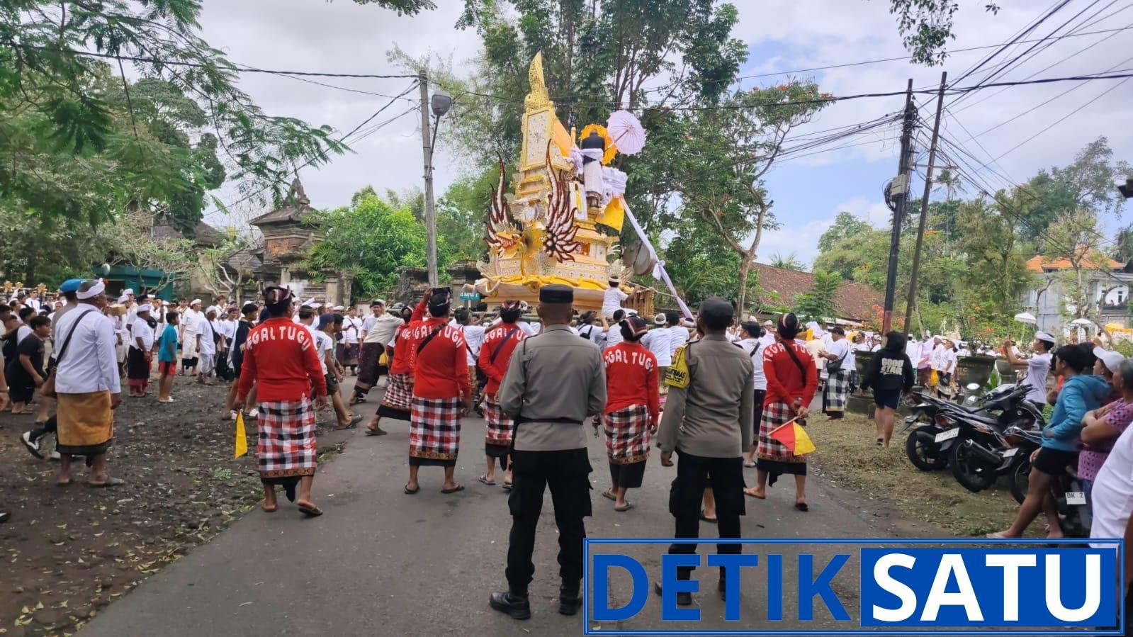 Jajaran Kepolisian Resor (Polres) Gianyar bersama Polsek Gianyar melaksanakan pengamanan kegiatan upacara adat Pelebon Alm. Ida Pedanda Gede Sadhawa Jelantik Putra yang berlangsung di Gria Sadhawa, Desa Tegal Tugu, Kecamatan Gianyar, pada Kamis (28/08/2025).