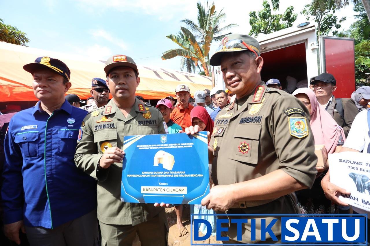 Cilacap, Detiksatu.id – Menteri Dalam Negeri (Mendagri) Jenderal Pol. (Purn) Prof. Muhammad Tito Karnavian Ph.D., menyerahkan empat unit tenda posko kepada Bupati Cilacap Syamsul Auliya Rachman sebagai dukungan pemerintah pusat terhadap penanggulangan bencana tanah longsor yang terjadi di Kecamatan Majenang, Kabupaten Cilacap, Jawa Tengah, Rabu (19/11/2025).
