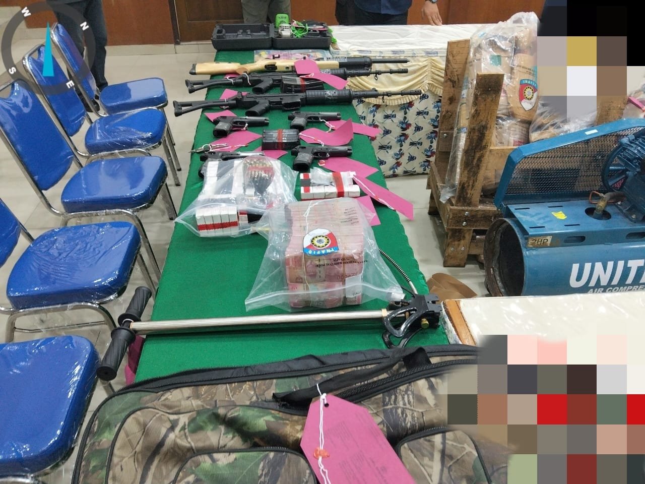 Dalam giat ini, sejumlah barang bukti yang diserahkan beberapa diantaranya adalah dua pucuk senpi laras panjang jenis SS1, empat pistol G2 Combat, satu senapan angin PCP, ratusan butir amunisi berbagai kaliber, serta satu unit kendaraan Toyota Hilux dan sejumlah dokumen rekening bank atas nama tersangka.