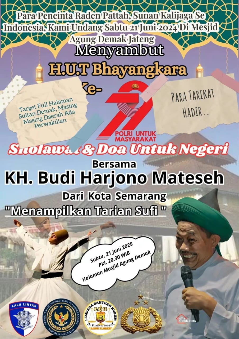 Demak, Detiksatu.id – Dalam momentum menyambut Hari Ulang Tahun (HUT) Bhayangkara ke-79, berbagai elemen masyarakat, termasuk para dzurriyah (trah) Raden Patah, para pecinta Sunan Kalijaga dari seluruh Indonesia, dan pengamal tarekat, akan berkumpul dan bersatu dalam acara akbar bertajuk “Sholawat & Doa untuk Negeri” di halaman Masjid Agung Demak, Jawa Tengah, Sabtu malam, 21 Juni 2025.