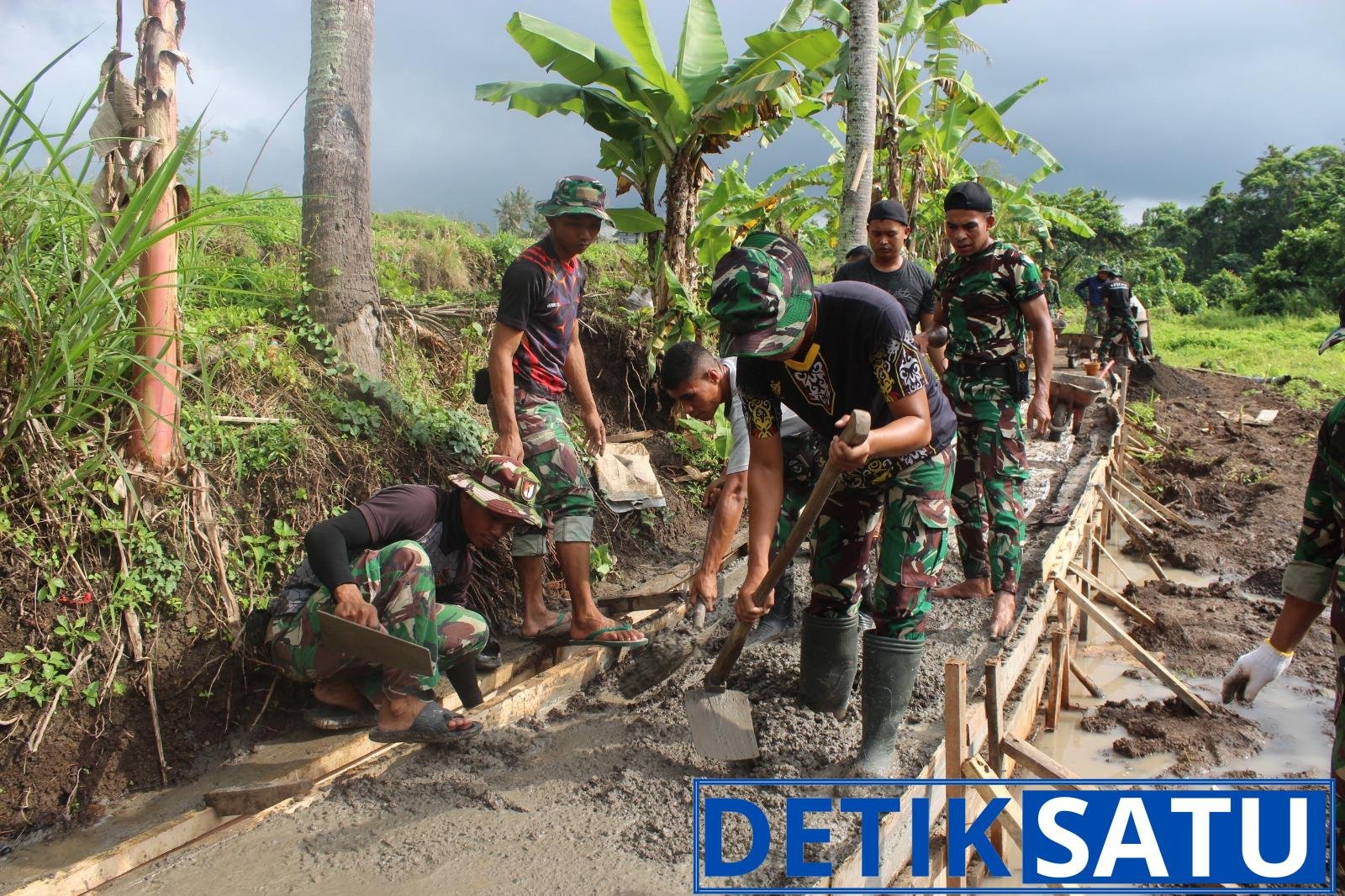 Di lapangan, Dan SSK Lettu Cpl I Nyoman Prajana memimpin langsung personel dan warga dalam pengerjaan fisik. Ia mengungkapkan bahwa keterlibatan masyarakat sangat luar biasa, mulai dari penggalian saluran air hingga pengecoran jalan setapak.