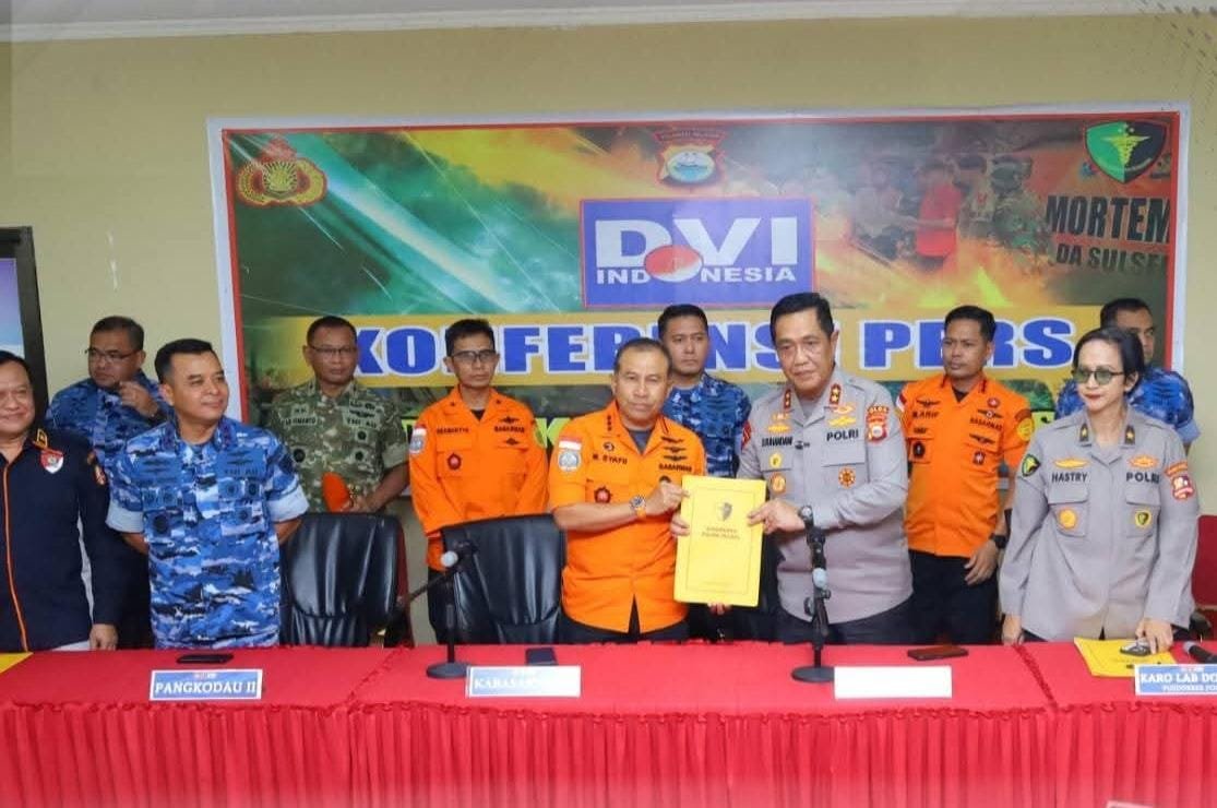 Penyerahan tersebut disampaikan dalam Konferensi Pers yang digelar di Biddokkes Polda Sulsel. Kegiatan dipimpin langsung oleh Kepala Basarnas RI Marsekal Madya TNI Mohammad Syafii, didampingi Kapolda Sulawesi Selatan Irjen Pol. Djuhandhani Rahardjo Puro, S.H., M.H., Pangkodau II Marsekal Muda TNI M. Untung Suropati, Kapusident Bareskrim Polri Brigjen Pol. Mashudi, Karo Labdokkes Pusdokkes Polri Brigjen Pol. dr. Sumy Hastry Purwanti, DFM, Sp.F, serta Kabiddokkes Polda Sulsel Kombes Pol. dr. Muhammad Haris.